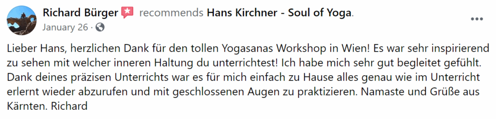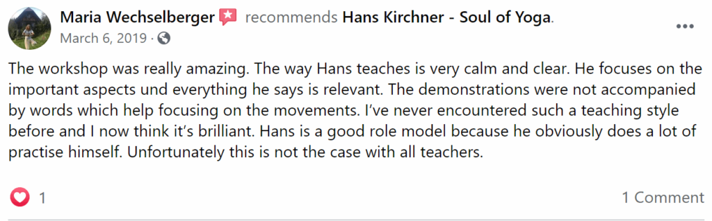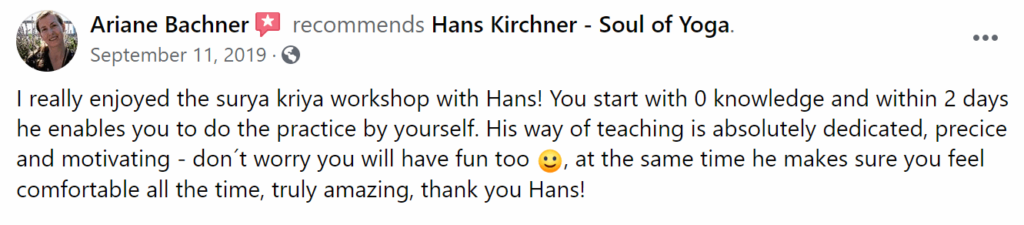 Vielleicht fragst Du Dich ob es wirklich möglich ist innerhalb von ein bis zwei Tagen die komplette Yogafolge zu lernen, so dass Du sie danach selbständig zuhause praktizieren kannst. In meiner Erfahrung funktioniert es in 95% der Fälle ohne Probleme! In manchen Fällen kommen danach noch ein paar Fragen auf, die wir am Telefon besprechen können. Und solltest Du entgegen aller Erwartungen immer noch Probleme haben, dann komm zu einer meiner Refinement Kurse!